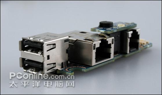 戴尔 Latitude D630的子卡,小小的面积上,具有两个USB接口,RJ11和RJ45接口,此外还具有麦克风和状态指示灯