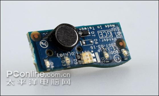 很袖珍的麦克风,下方的发光二极管即是状态指示灯,这两部分又是以一块独立的子卡